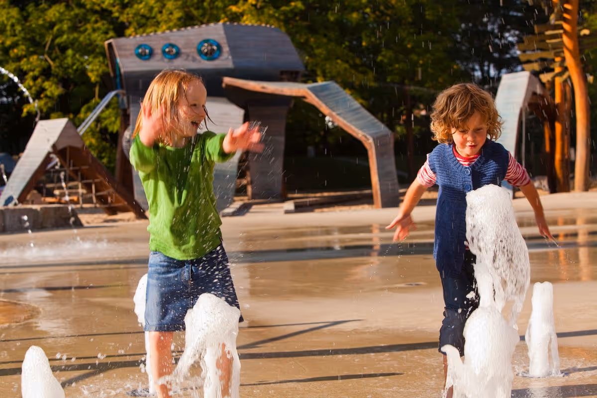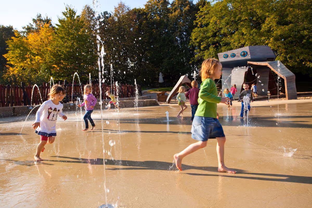 Auf unserem einzigartigen Fontänenfeld könnt Ihr sicher spielen und toben – ohne „Baden zu gehen“.